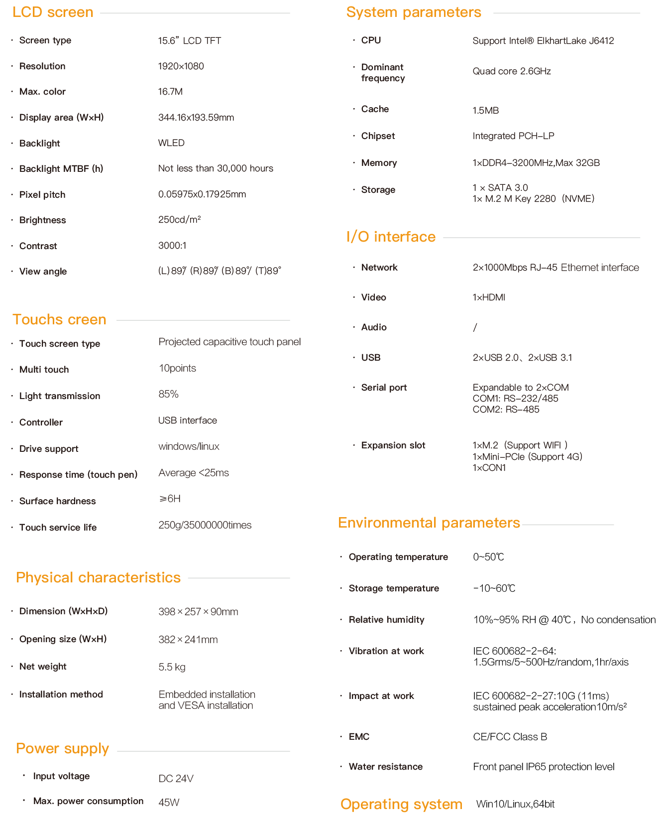 SPC-4715L is an embedded industrial capacitive touch tablet computer. It features a fanless quiet design, integrating industrial display and touchscreen technologies. The product is compact in structure, easy to install, and convenient to operate. It is an efficient and reliable industrial computer system. The entire machine is equipped with a 15.6-inch high-definition LCD display with a resolution of 1920x1080, featuring rich and detailed colors and a wide viewing angle. It is powered by a 12-24V wide-voltage DC supply. The touch screen is a projected capacitive screen, supporting 10-point touch. The main unit is based on the Intel ElkhartLake processing platform CPU and uses the J6412 processor. It is equipped with a large-capacity solid-state SSD, DDR4 memory supporting 1×32G capacity, 4×USB interfaces, 3 intel gigabit network cards, expandable 2 COM ports, COM1 port supporting RS232/422/485, and COM2 port supporting RS232/485. There is an internal Mini-PCIe expansion slot for 4G expansion, 1 M.2 for WIFI expansion, and 1 HDMI interface for multi-display mode. The SPC-4715L supports multiple installation methods: hook-and-socket embedded installation, VESA-based wall-mounted and cantilever installation. The front panel complies with NEMA/IP65 waterproof and dustproof standards, preventing water droplets from splashing in during installation in the control cabinet. The high-strength all-steel sealed box structure has shock and vibration protection functions. Especially, the dedicated EMC design enables the entire machine to have excellent anti-interference capability, capable of adapting to the harsh working environment in industrial sites with strong interference. It is widely used in factory automation, mechanical manufacturing, CNC equipment, textile equipment, communica- tion networks, and power automation and other industrial scenarios with strong interference.