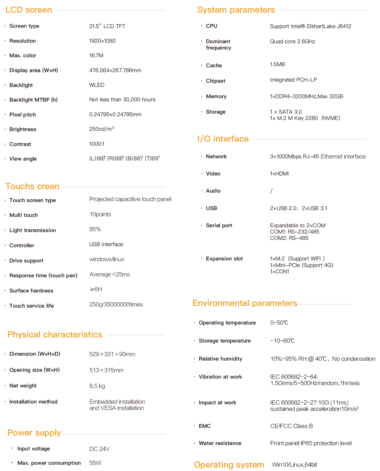 SPC-4722L is an embedded industrial capacitive touch tablet computer. It features a fanless quiet design, integrating industrial display and touchscreen technologies. The product is compact in structure, easy to install, and convenient to operate. It is an efficient and reliable industrial computer system. The entire machine is equipped with a 21.5-inch high-definition LCD display with a resolution of 1920x1080, featuring rich and detailed colors and a wide viewing angle. It is powered by a 12-24V wide-voltage DC supply. The touch screen is a projected capacitive screen, supporting 10-point touch. The main unit is based on the Intel ElkhartLake processing platform CPU and uses the J6412 processor, with a large-capacity solid-state SSD configuration. DDR4 memory supports a 1×32G capacity, 4×USB interfaces, 3 intel gigabit network cards, and can support the expansion of 2 COM ports. COM1 port supports RS232/422/485, and COM2 port supports RS232/485. There is an internal Mini-PCIe expansion slot that can support 4G expansion, 1 M.2 for WIFI expansion, and 1 HDMI interface for multi-display mode. The SPC-4722L supports multiple installation methods: hook-and-socket embedded installation, VESA-based wall-mounted and cantilevered installation, the front panel complies with NEMA/IP65 waterproof and dustproof standards, preventing water droplets from splashing in during installation in the control cabinet and entering, the high-strength all-steel sealed box structure has shock and vibration protection functions, especially the specialized EMC design enables the entire machine to have excellent anti-interference capability, capable of adapting to the harsh working environment of industrial sites, and is widely used in factory automation, mechanical manufacturing, CNC equipment, textile equipment, communica- tion networks, power automation and other industrial environments with strong interference.