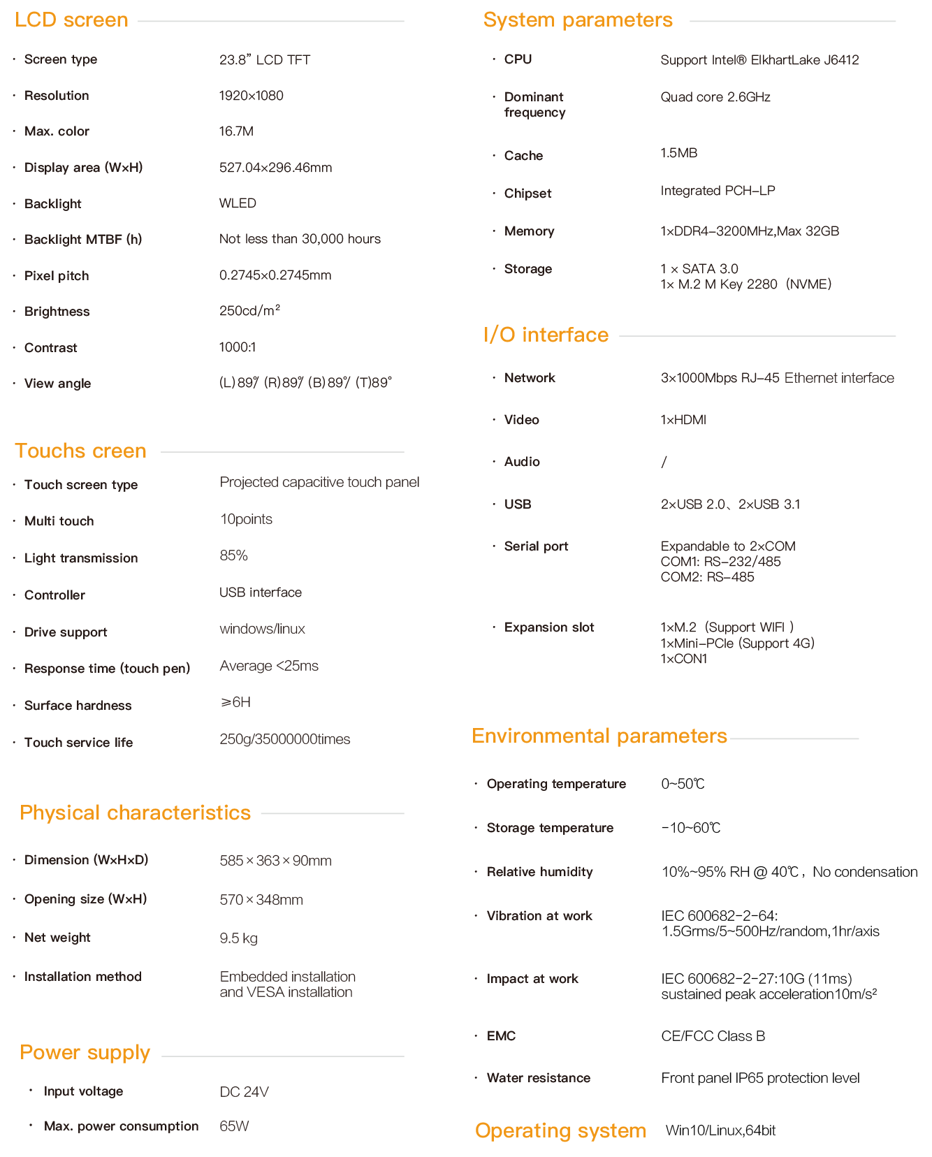 SPC-4724L is an embedded industrial capacitive touch tablet computer. It features a fanless quiet design, integrating industrial display and touchscreen technologies. The product is compact in structure, easy to install, and convenient to operate. It is an efficient and reliable industrial computer system. The entire machine is equipped with a 23.8-inch high-definition LCD display with a resolution of 1920x1080, featuring rich and detailed colors and a wide viewing angle. It is powered by a 12-24V wide-voltage DC supply. The touch screen is a projected capacitive screen, supporting 10-point touch. The main unit is based on the Intel ElkhartLake processing platform CPU and uses the J6412 processor, with a large-capacity solid-state SSD configuration. DDR4 memory supports a 1×32G capacity, 4×USB interfaces, 3 intel gigabit network cards, and can support the expansion of 2 COM ports. COM1 port supports RS232/422/485, and COM2 port supports RS232/485. There is an internal Mini-PCIe expansion slot that can support 4G expansion, 1 M.2 for WIFI expansion, and 1 HDMI interface for multi-display mode. The SPC-4724L supports multiple installation methods: hook-and-socket embedded installation, VESA-based wall-mounted and cantilevered installation, the front panel complies with NEMA/IP65 waterproof and dustproof standards, preventing water droplets from splashing in during installation in the control cabinet and entering, the high-strength all-steel sealed box structure has shock and vibration protection functions, especially the specialized EMC design enables the entire machine to have excellent anti-interference capability, capable of adapting to the harsh working environment of industrial sites, and is widely used in factory automation, mechanical manufacturing, CNC equipment, textile equipment, communica- tion networks, power automation and other industrial environments with strong interference.